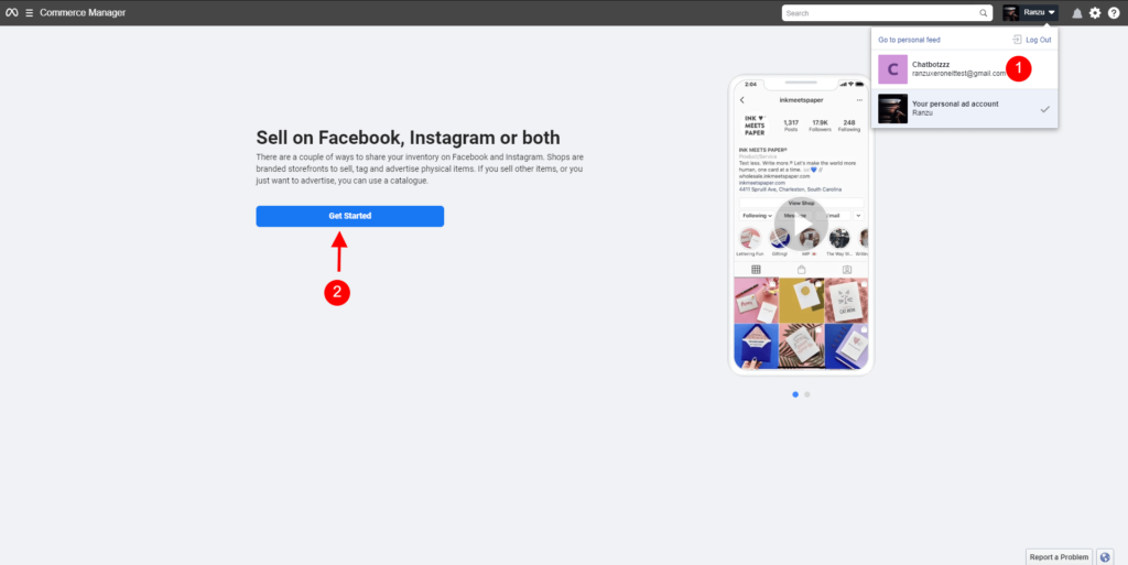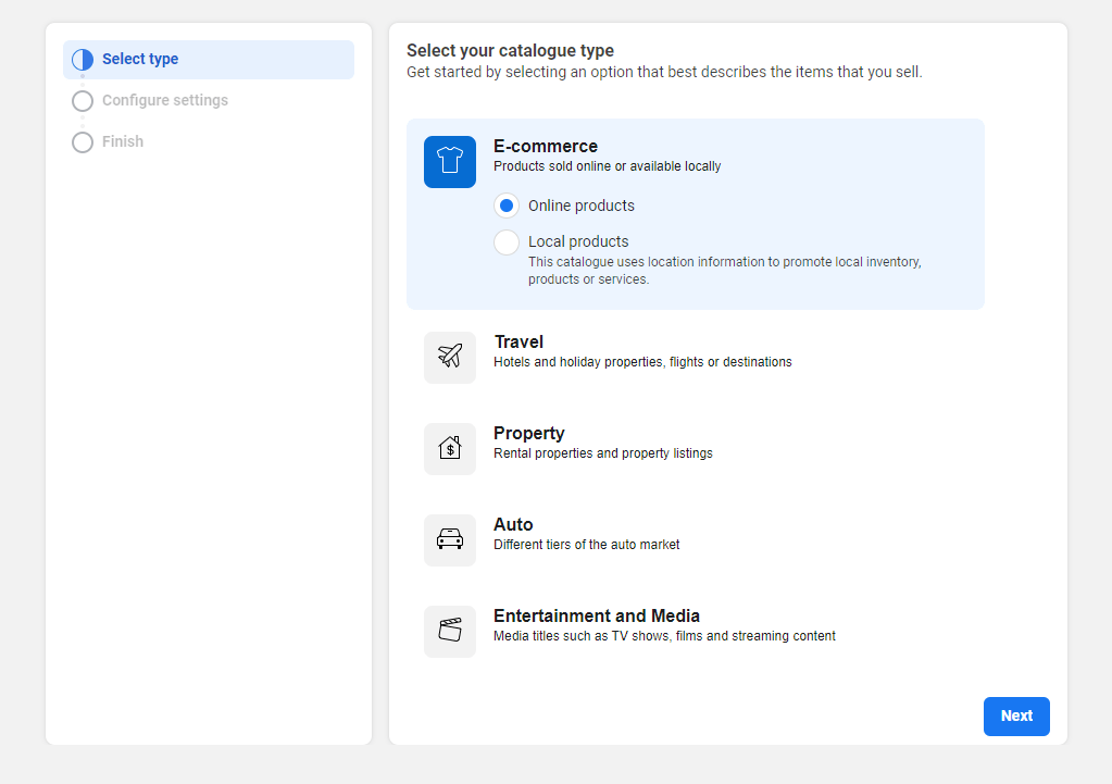 3. On the next page just select the option to create a catalog and then click on the get started button again. Then select ecommerce and select the product types whether they are online products or local products. Then click on the next button.