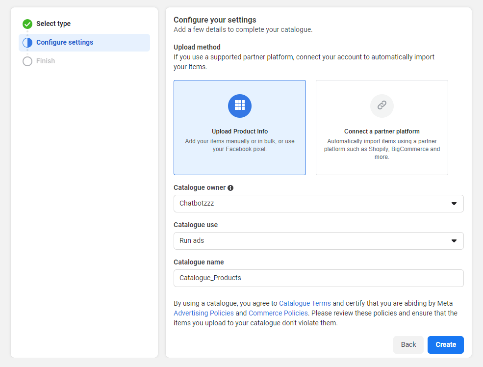 4. You have to select an upload method. There are two types of upload methods. One is to upload manually and the other one is by connecting partner platforms like Shopify and BigCommerce. Then select the catalog owner, it’s actually the business that you have with Facebook. Then there is catalog use and catalog name. You need to provide a catalog name here.
