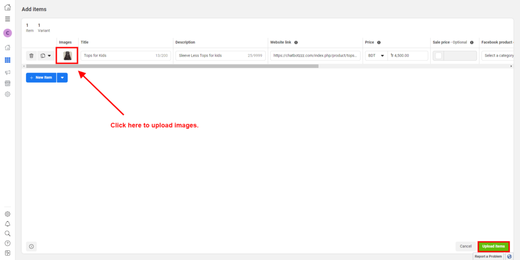 5. After creating the catalog click on the view catalogue. Then click on the add items button to add products. Then select Manual to upload the product manually. We need to upload images, titles, and descriptions of the product. Finally, click on the upload items button. You can add as many products as you want.