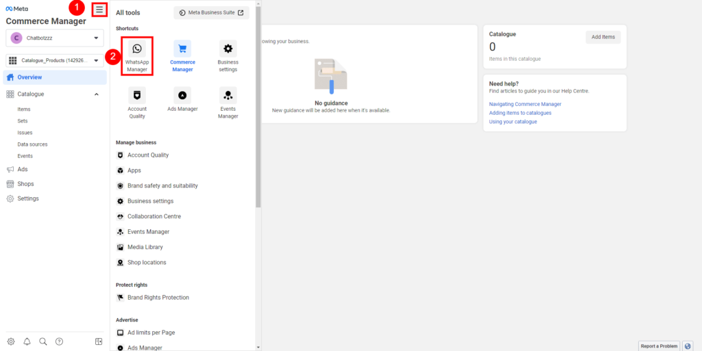 Step 2 then explains how to add the catalog to the WhatsApp Cloud API through the WhatsApp Manager in the account tools.